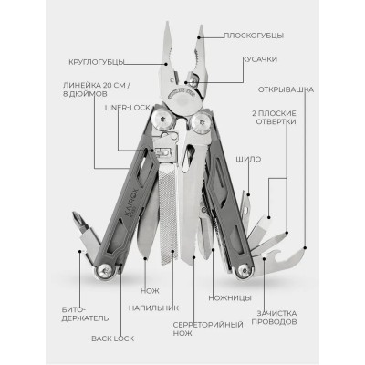 • Мультитул, чехол, запасные сменные кусачки, ключ для замены кусачек, 8 бит, 2 пилы по дереву